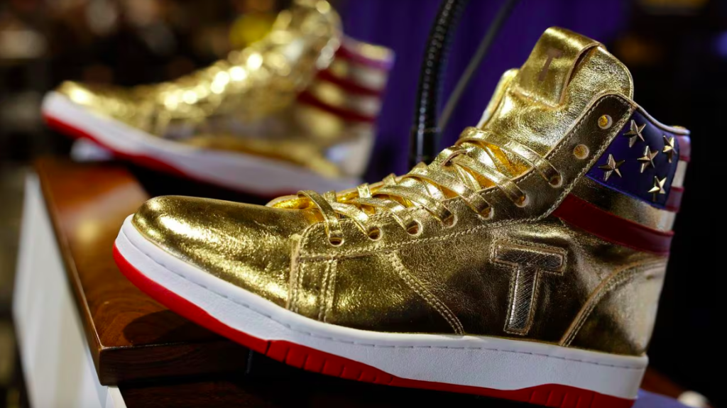 Las zapatillas, de color dorado con una T a un costado y en la parte de atrás la bandera estadounidense se venden como “Never Surrender High-Tops” y se agotaron en menos de un día y solo se fabricarán 1.000 pares.