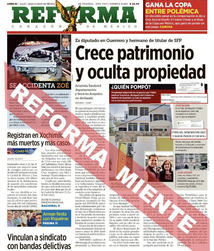En la primera plana de dicho diario, se publicó este lunes que Sandoval Ballesteros poseé entre sus propiedades una “finca” en el Puerto de Acapulco, misma que no se encuentra en su declaración patrimonial, con lo cual “Reforma miente y calumnia una vez más”.