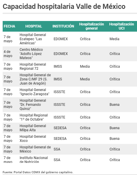 La información sobre la ocupación hospitalaria está disponible en el portal Datos CDMX. Este texto y la tabla están basados en las cifras actualizadas hasta el 7 de mayo a las 17:35 horas.