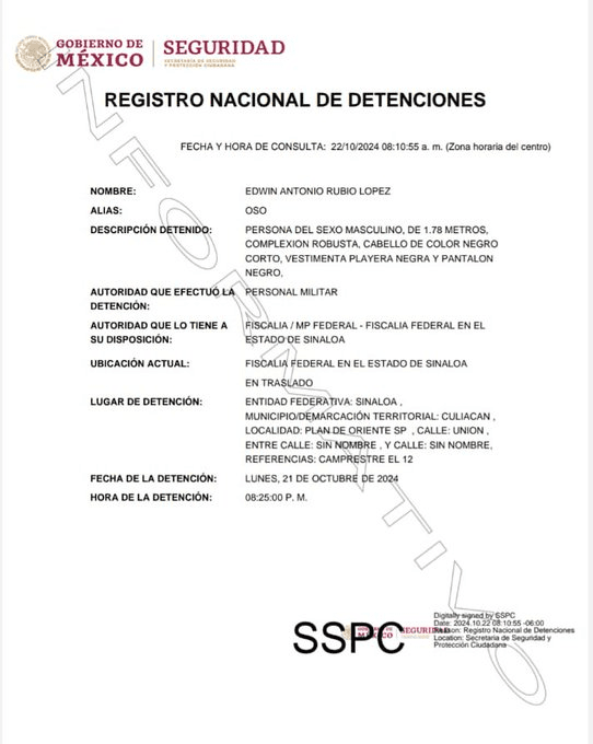 De acuerdo con la información oficial, la detención tuvo lugar durante un enfrentamiento registrado el lunes 21 de octubre en la sindicatura de Sanalona, situada a unos 30 kilómetros de Culiacán.