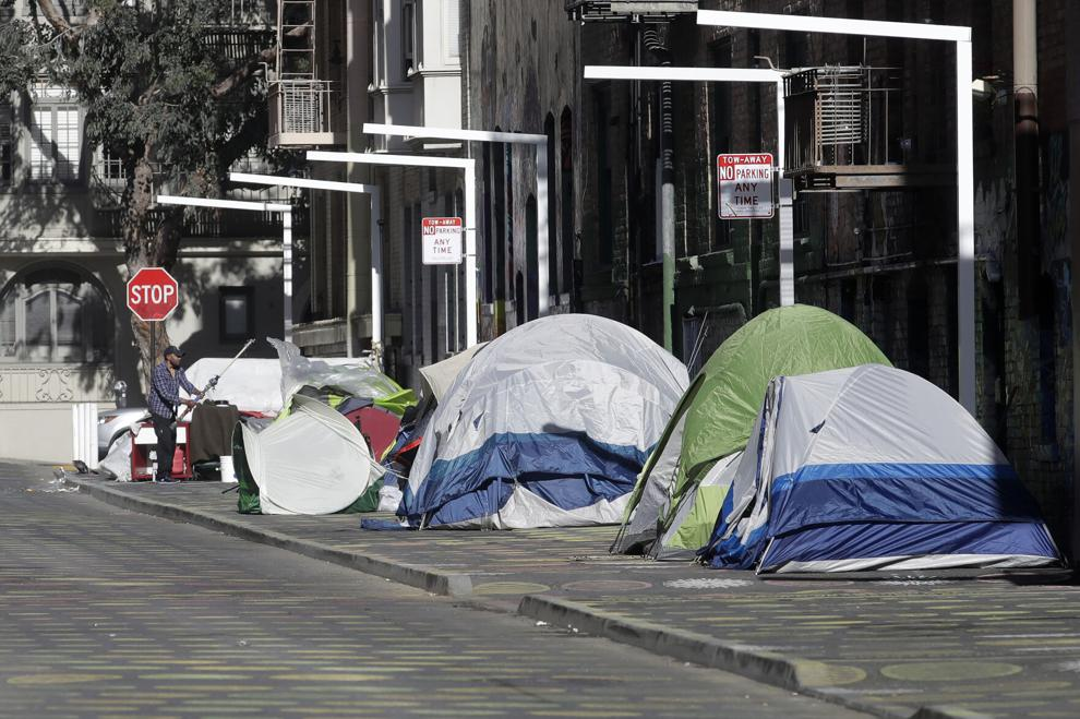 A man stands next to tents on a sidewalk in San Francisco, Tuesday, April 21, 2020.Jeff Chiu / AP