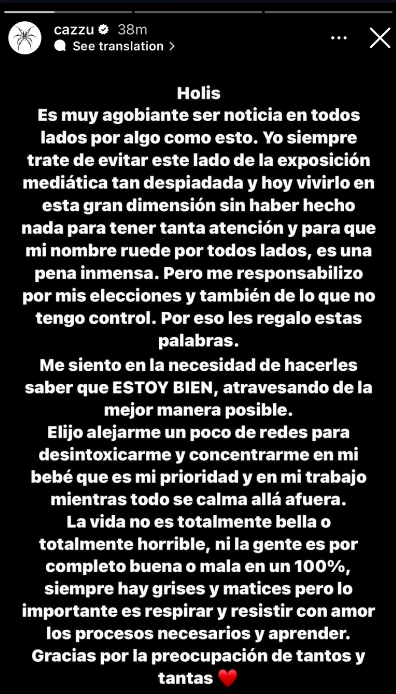 Cazzu, expareja de Nodal y madre de su hija, rompió su silencio a través de sus redes sociales. “Asumo la responsabilidad de mis decisiones y también de aquello sobre lo que no tengo control”, manifestó Cazzu en una historia de Instagram. “Elijo alejarme de las redes para concentrarme en mi bebé, que es mi prioridad y en mi trabajo”, añadió.
