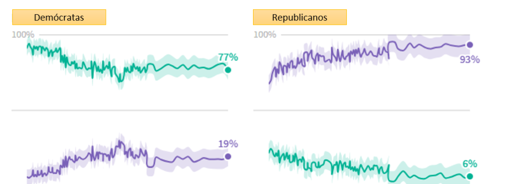 El reporte de Reuters también menciona que las principales preocupaciones de los votantes son la economía y la inmigración. Es notoria la inclinación hacia una o la otra dependiendo de la inclinación política. Los simpatizantes del Partido Republicano resaltan como mayor amenaza la inmigración. Lo cual posiblemente se deba a los comentarios de Trump con tintes racistas y xenofóbicos. Mientras los simpatizantes del Partido Democrático se centran en el estado de la economía (aunque esta situación parece inquietar a nivel general).