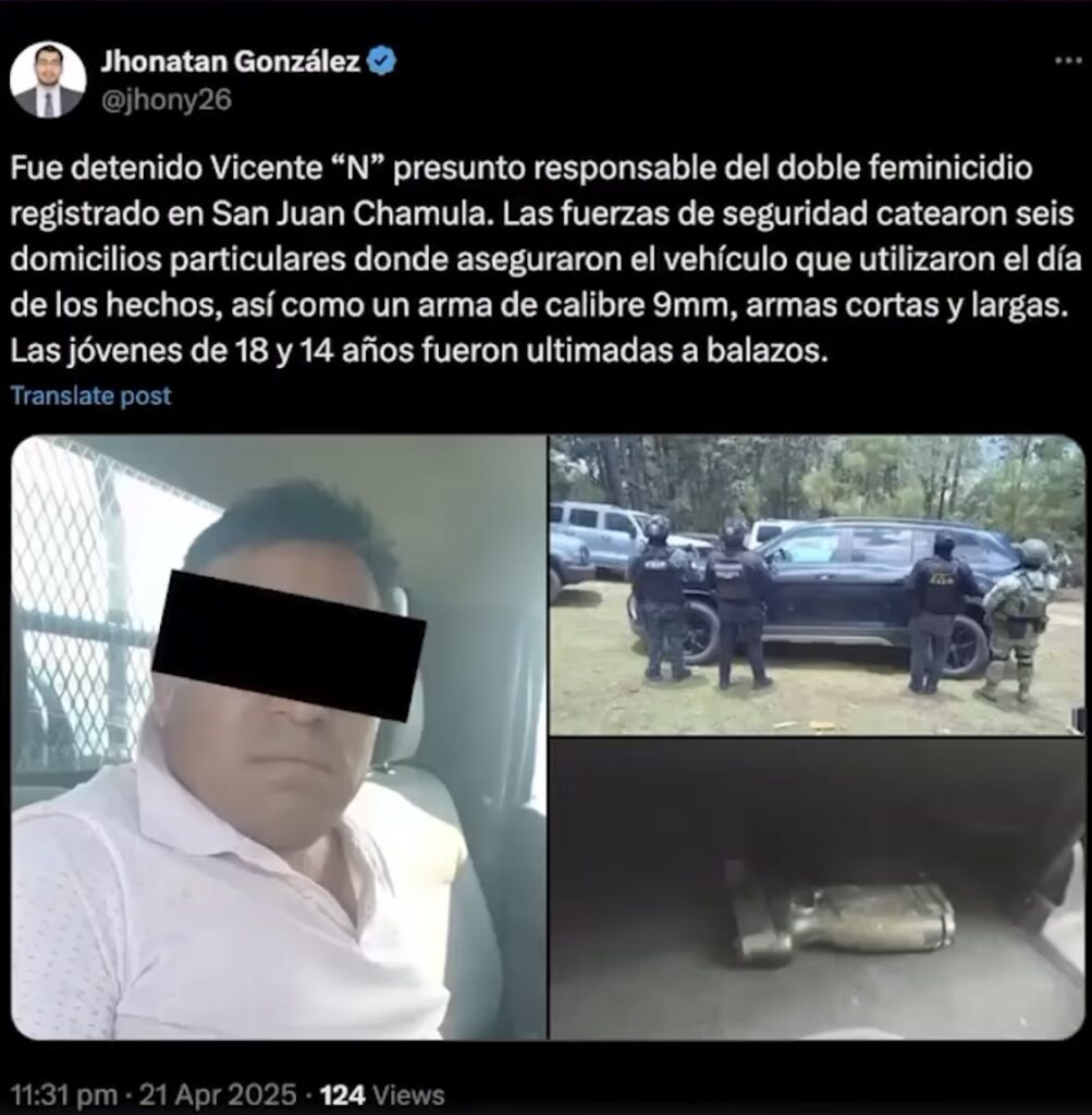 La Fiscalía General del Estado de Chiapas, en coordinación con autoridades de Tabasco, logró la detención de Vicente “N”, presunto responsable del doble feminicidio. El sujeto fue asegurado cuando intentaba huir hacia la Península de Yucatán. En su vehículo se encontró un arma de fuego calibre 9 mm, presuntamente utilizada en el crimen.