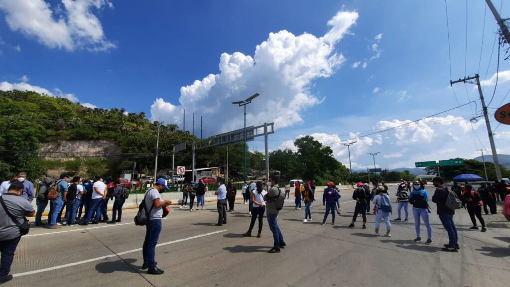 La movilización, en la que participaron unos 60 jóvenes, partió de las instalaciones de esa institución, ubicada al poniente de la capital, y avanzaron sobre el carril norte-sur de alta velocidad de esa via de comunicación federal con dirección al Parador del Marqués, el cual bloquearon.