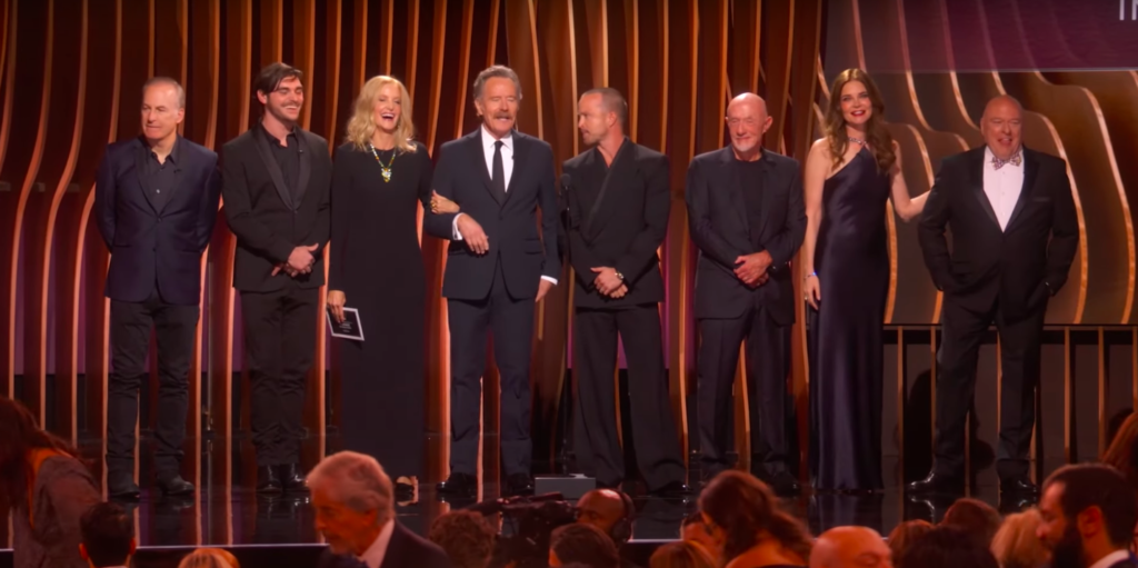 A medida que Bryan Cranston, Anna Gunn, Aaron Paul, Dean Norris, Bob Odenkirk, Betsy Brandt, RJ Mittle y Jonathan Banks subían al escenario para anunciar el premio, había una sensación de nostalgia en el aire. Craston que interpreto el personaje de Walter White expresó: “Estar juntos de nuevo, en este escenario, después de tantos años, es un momento en la historia”.