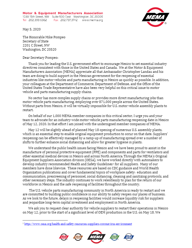 La Asociación de Manufacturera de Automotores y Equipos (MEMA por sus siglas en inglés) pidió en una carta a Mike Pompeo, Secretario de Estado de Estados Unidos, pedir la autorización expresa a México para que las empresas productoras de autopartes en el país reabran sus operaciones el 12 de mayo, seis días antes de que el sector manufacturero de equipo original (OEM, en inglés) estadounidense reanude operaciones.