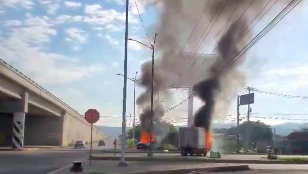 No nomás en #Culiacán: hace unos momentos, civiles armados incendiaron vehículos y cerraron la carretera #Mazatlán – #Durango, desde la caseta de Mesillas a la de Coscomate.