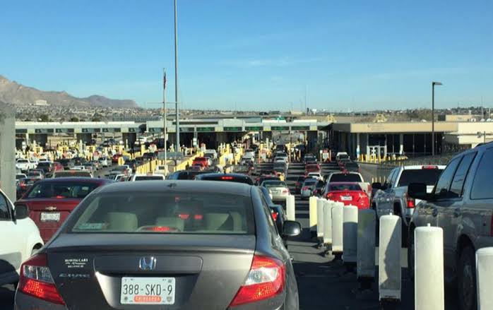 La fila de vehículos con personas que se dirigen a El Paso, por el puente Santa Fe, llega por avenida Juárez hasta la calle Abraham González.