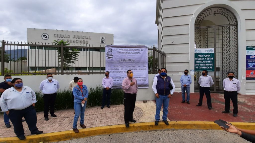Chilpancingo, Guerrero.- Abogados postulantes se manifestaron el exterior de la Ciudad Judicial de Chilpancingo, para exigir a este poder el reinicio de las actividades que a causa del confinamiento por el Covid-19, se ha provocado una parálisis en la impartición de justicia.