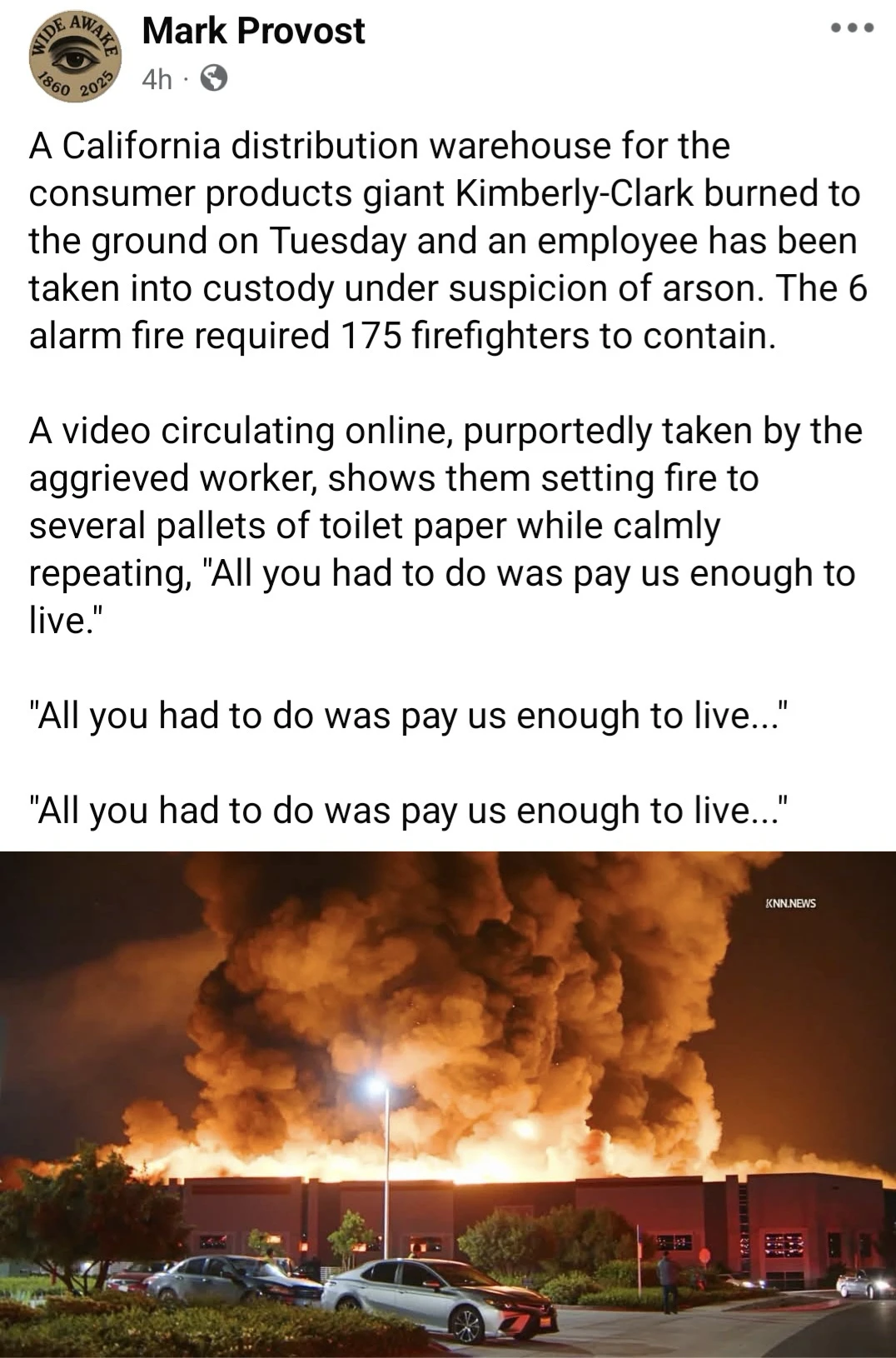 En una andanada de un trabajador descontento que luchaba por la buena batalla de la guerra de clases, un incidente ocurrido el 7 de abril de 2026, se produjo un incendio masivo en un almacén de Kimberly-Clark en Ontario, California, que provocó grandes daños estimados en 213 millones de dólares. El incendio, alimentado por los productos de papel de la instalación, alcanzó un estado de seis alarmas y requirió una importante respuesta de emergencia. Chamel Abdulkarim, un empleado de 29 años de NFI Industries, un distribuidor externo de Kimberly-Clark, ha sido arrestado por cargos relacionados con incendio provocado.