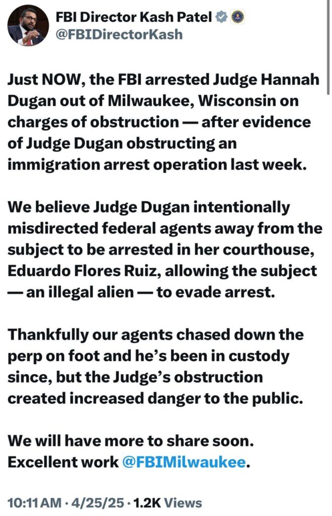 “We believe Judge Dugan intentionally misled federal agents regarding the whereabouts of the individual to be arrested in her courtroom, Eduardo Flores Ruiz, thereby enabling the subject — an undocumented immigrant — to evade capture,” Patel wrote in a post on social media platform X, which was deleted minutes later.