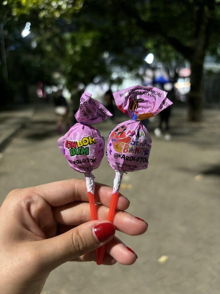 The actual concert and build up was incredible. Karol G’s visuals dominant in the city space. It wasn’t Karol G’s night, man, it was her city. As we approached the actual soccer stadium hosting her event, everything was about La Bichota. One can not help but think that this was a carefully coordinated event between city officials, Karol G’s label and the vast number of merchants benefiting from the foot traffic. Even custom lollipops were made by Colombina: