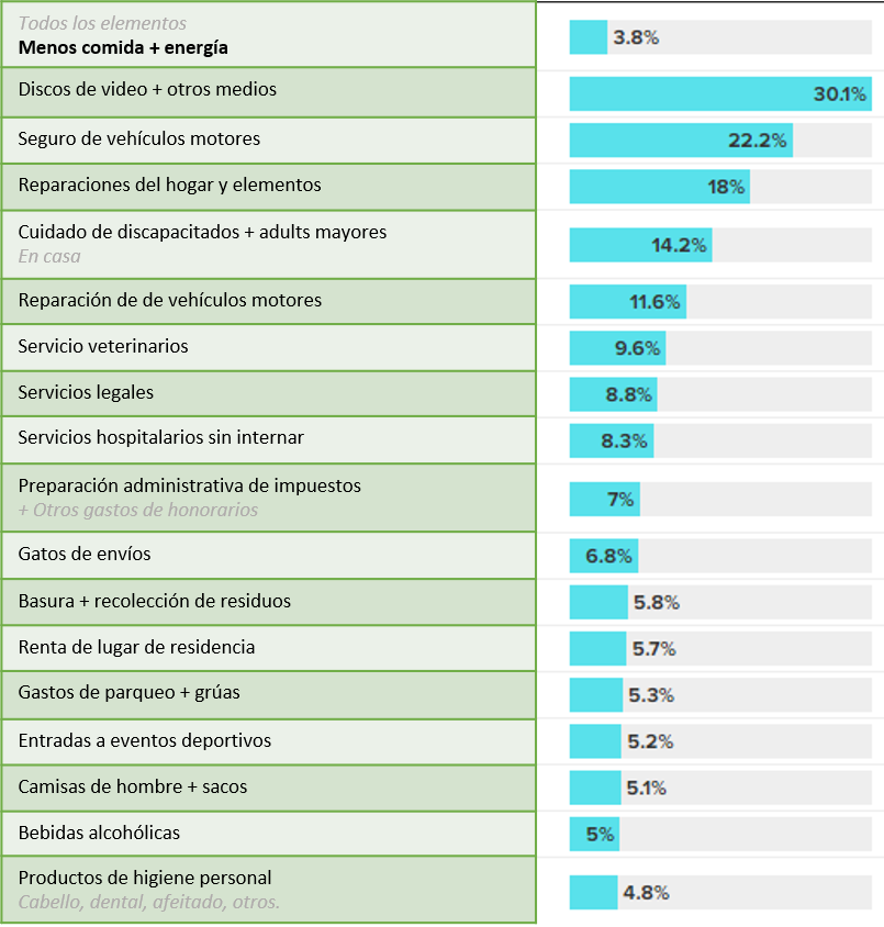 El IPC es el indicador que mide qué tan rápido y cómo cambian los precios en la economía, tanto de bienes como servicios. Mide todo, desde frutas y verduras hasta cortes de pelo, boletos de conciertos y electrodomésticos para el hogar. Es un análisis exhaustivo, para comprender mejor el caso de EE.UU. CNBC desarrolló la siguiente tabla. La cual muestra elementos y su porcentaje de aumento respecto a 2023.