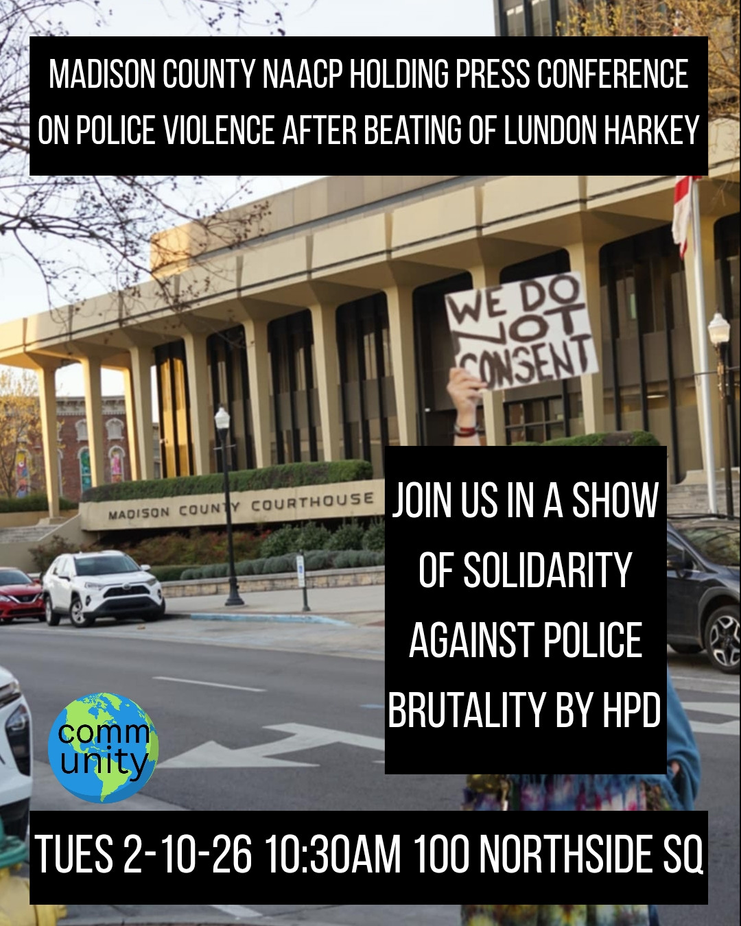 La sección de la NAACP del condado de Madison celebró una conferencia de prensa el martes 10 de febrero a las 10:30 a. m. para abordar la grave golpiza sufrida por Lundon Harkey, de 27 años, en el tribunal del condado de Madison en Huntsville, Alabama. El incidente ha atraído una importante atención pública en medio de un escrutinio cada vez mayor de la conducta policial durante los procedimientos de arresto.