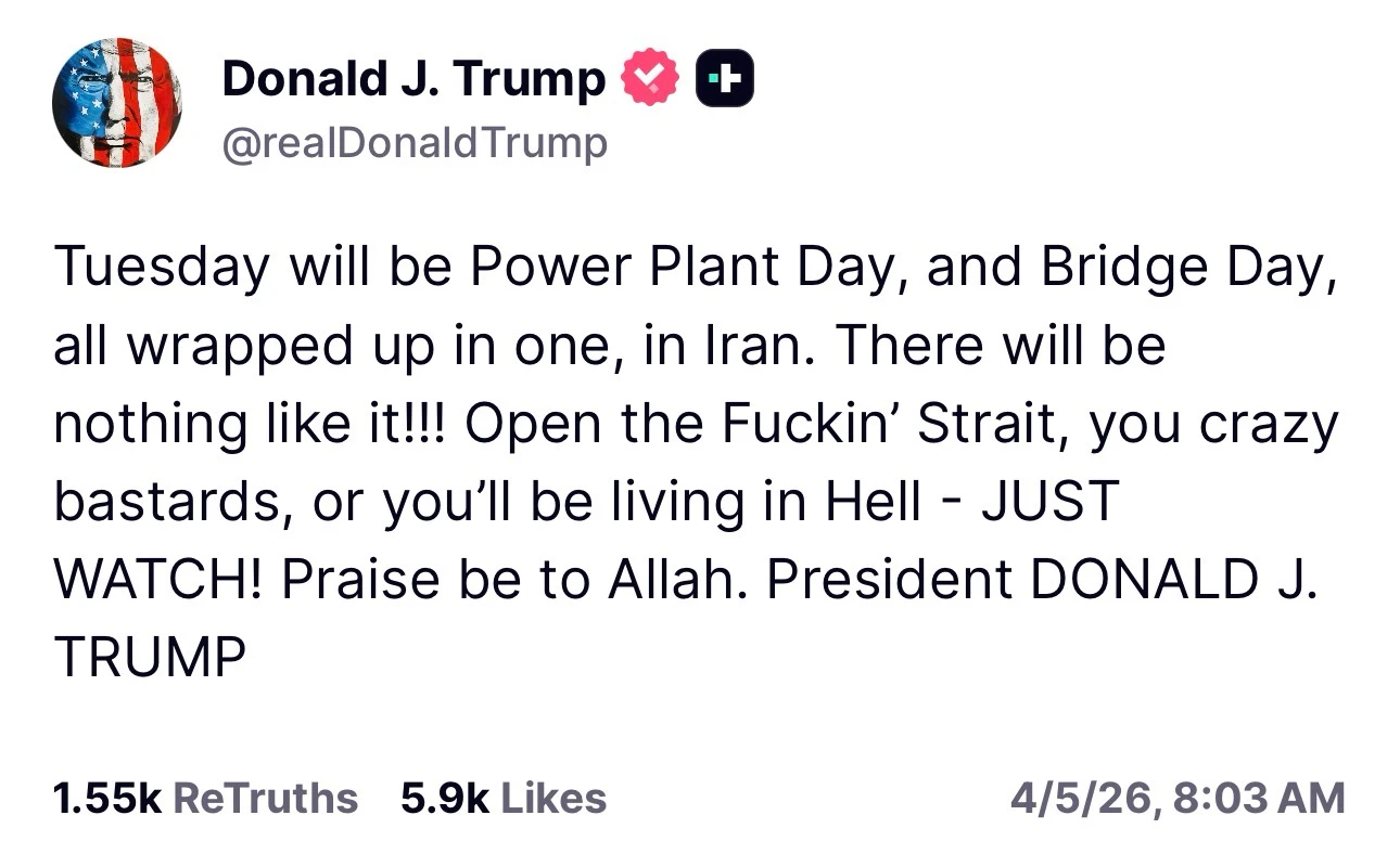 En una provocativa publicación en las redes sociales a primera hora de la mañana del domingo de Pascua, el escándalo de Epstein vinculó al presidente Donald Trump exigiendo a Irán que “abran el maldito estrecho, locos bastardos, o vivirán en el infierno”. Los comentarios, compartidos en la plataforma Truth Social de Trump, han provocado críticas generalizadas y han llamado la atención sobre su tono en medio de las tensiones actuales en el Medio Oriente, particularmente en torno al estratégicamente vital Estrecho de Ormuz.