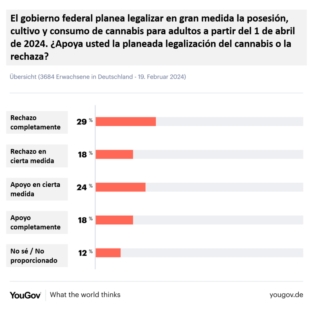 Igualmente, el presidente del sindicato de policía Jochen Kopleke expresó su preocupación “No hay normas claras para nosotros como policías sobre cómo debemos actuar en lo que respecta al cannabis. Hay muchas cosas que no están claras y por eso la ley aún no está lista” dijo en una entrevista con Fance24. Por otro lado, según la encuesta pública realizada por YouGov Alemania el 19 de febrero de 2024 las opiniones son muy variadas (a diferencia de los datos que recorren las redes diciendo que el país está completamente dividido).