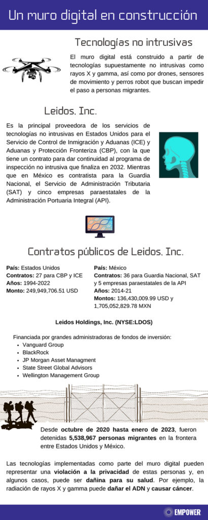 En la frontera entre México y Estados Unidos se levanta una nueva especie de muro anti migrantes indocumentados. Se trata de un “muro digital” construido con tecnologías que van desde el uso de datos biométricos e inteligencia artificial para la vigilancia hasta las “no intrusivas”, como el uso de rayos X y rayos gamma para inspeccionar vehículos de carga. El proveedor más grande de los sistemas de inspección es la empresa Leidos, empresa que ha tenido contratos públicos en México por más de mil 75 millones de pesos.