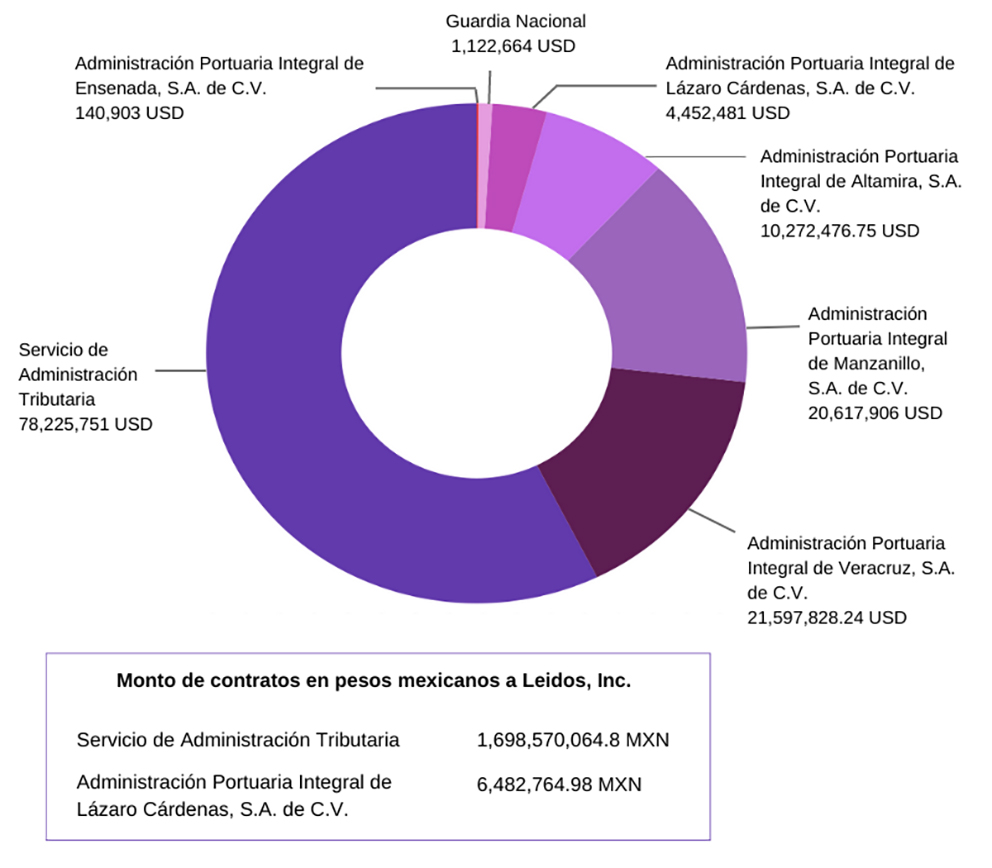 Cabe mencionar que Leidos también es proveedora del Gobierno mexicano, particularmente de la Guardia Nacional, del Servicio de Administración Tributaria (SAT) y de cinco empresas paraestatales de la Administración Portuaria Integral (API), de acuerdo con información publicada en Compranet.