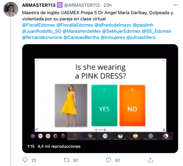 Una maestra de inglés de la Universidad Autónoma del Estado de México (UAEMex) fue agredida por un hombre, su presunta pareja, mientras impartía una clase virtual.