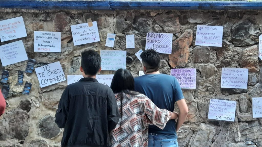 Otras frases, eran sobre las situaciones directas que las alumnas han sufrido en esta escuela, “Asco su literatura erótica profe”, “el maestro Elino me miraba de forma inapropiada e intentaba tocarme”, “¿Apoco a ti nunca te han acosado en la FACOM?”, “No quiero pozole, ok”, “lástima que la maestría y el doctorado no quiten los acosador”.