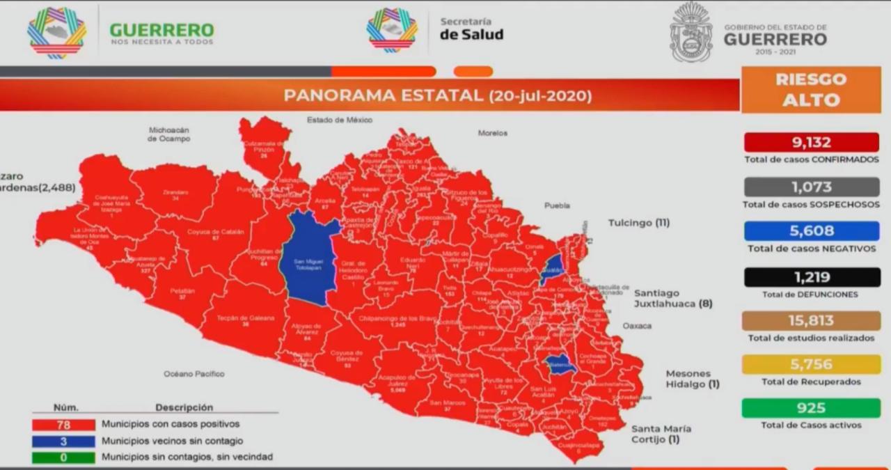 Para la semana Epidemiología número 30, el secretario de Salud del Estado de Guerrero, Carlos de la Peña Pintos, informó que en la última jornada se registraron 146 nuevos casos, quedando sólo 3 muncipios sin contagios y 78 ya presentan al menos un caso.