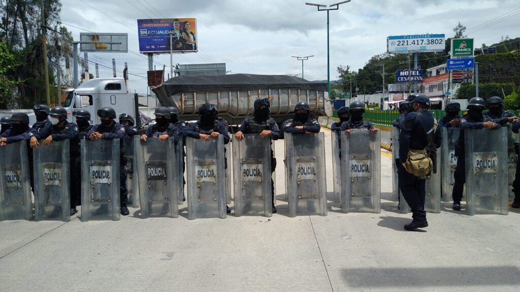 Chilpancingo, Guerrero.- Elementos de la Policía Estatal y Guardia Nacional replegaron con equipo antimotines a un grupo de maestros que bloquearon la Autopista del Sol al sur de Chilpancingo, en el punto conocido como El Parador del Marqués.