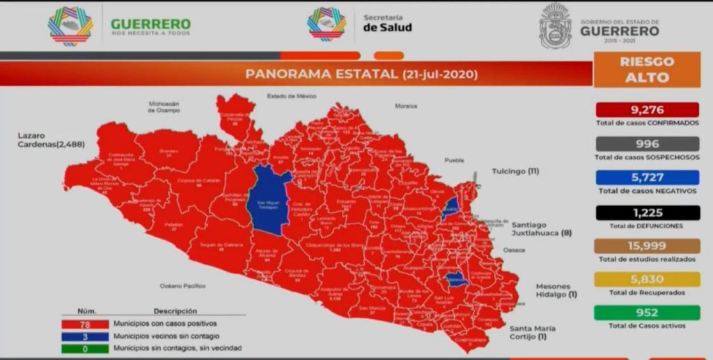 Al corte de este mediodía, Guerrero acumula 9 mil 276 casos de Covid-19, mil 125 defunciones, que le permiten al estado continuar en semáforo naranja hasta el próximo 30 de este mes, informó el secretario de Salud, Carlos de la Peña Pintos.