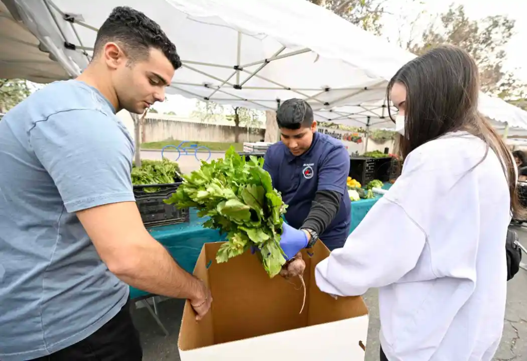 La voluntaria Pawrsa Nikzad, estudiante de cuarto año de UC Riverside, dijo que muchos vendedores del mercado de agricultores están felices de donar sus productos excedentes al final del día.