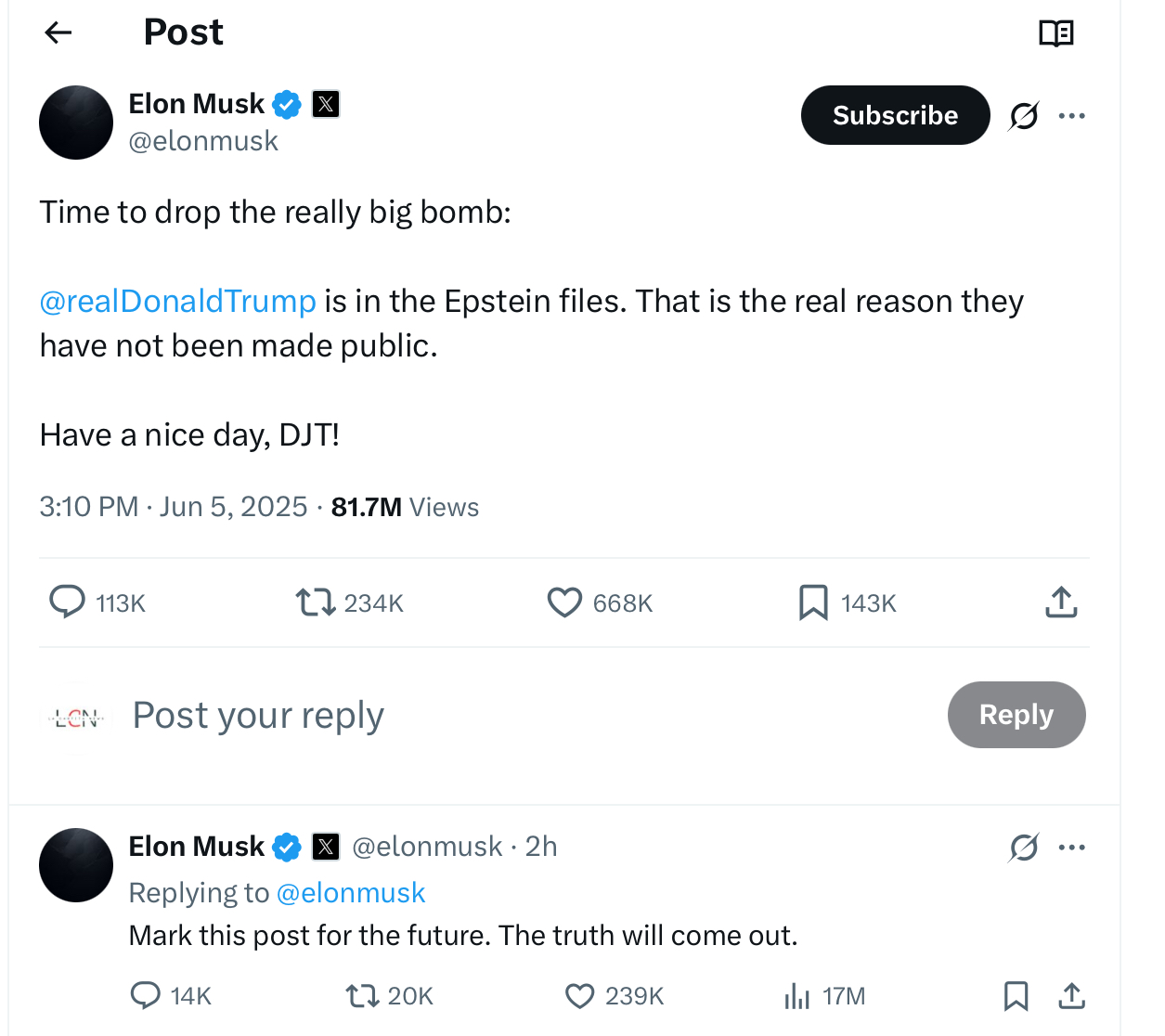 Amid this policy spat, Musk dropped what many see as his most incendiary claim yet—“Time to drop the really big bomb: @realDonaldTrump is in the Epstein files. That is the real reason they have not been made public. Have a nice day, DJT!”