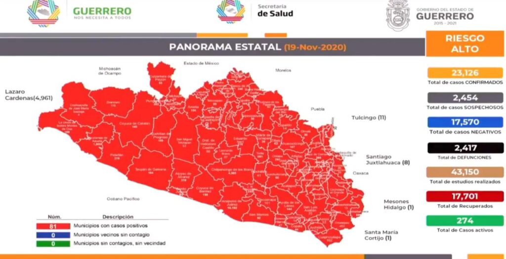 Actualmente hay un total de 274 casos activos conocidos, de los cuales el 88% de ellos se concentra en 15 municipios, destacando Acapulco con 101, Chilpancingo con 54 y Acapulco con 23.
