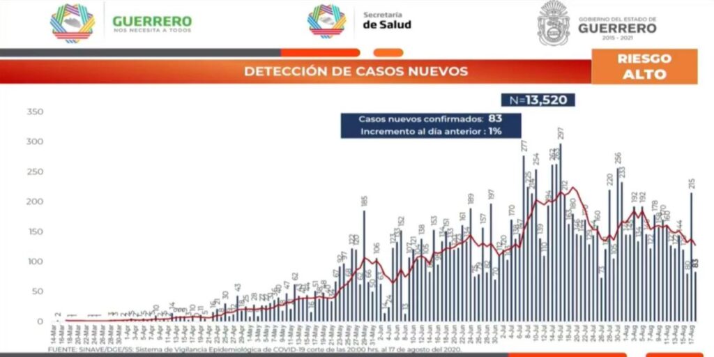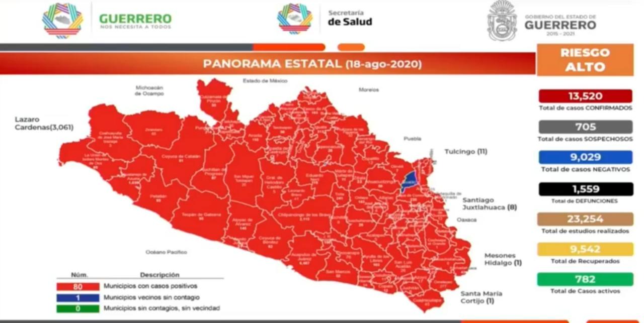 Al día de hoy, Guerrero acumula 13 mil 520 casos de Covid-19, mil 559 defunciones, y 782 casos activos, que se concentran en los municipios de Chilpancingo con 203, Acapulco con 188 y Zihuatanejo 52, distribuidos en diferentes hospitales.