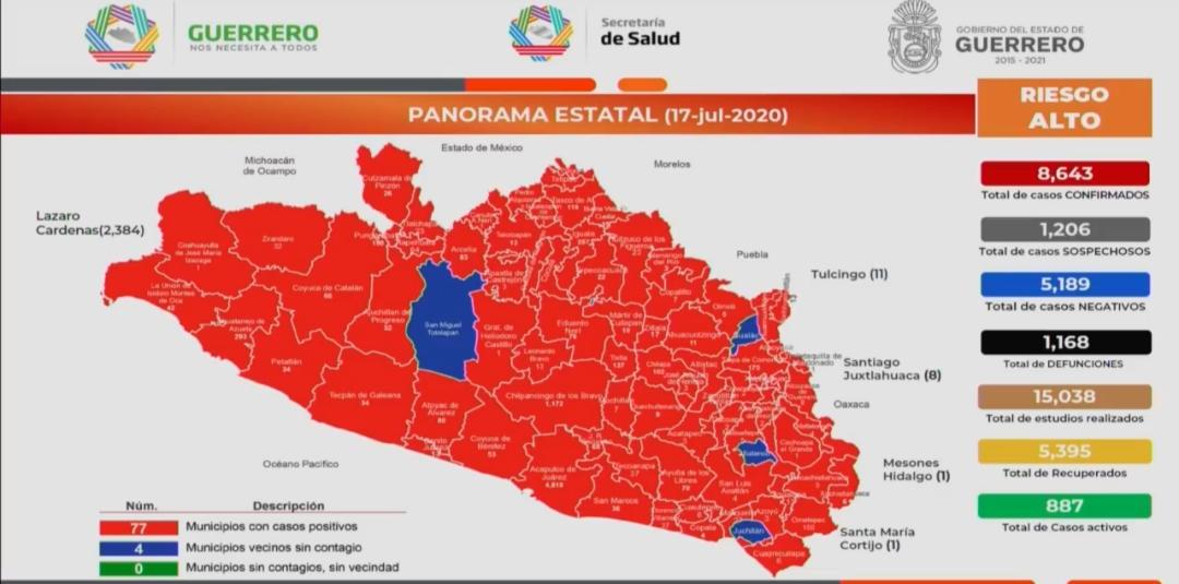 El titular de la SSa, Carlos de la Peña Pintos informó que Guerrero presenta mil 206 casos sospechosos, 5 mil 189 negativos y un total de 8 mil 643 casos positivos y acumulados, de los cuales mil 168 han fallecido, 5 mil 395 se han recuperado y 887 siguen activos, además de que se han realizado 15 mil 38 estudios.