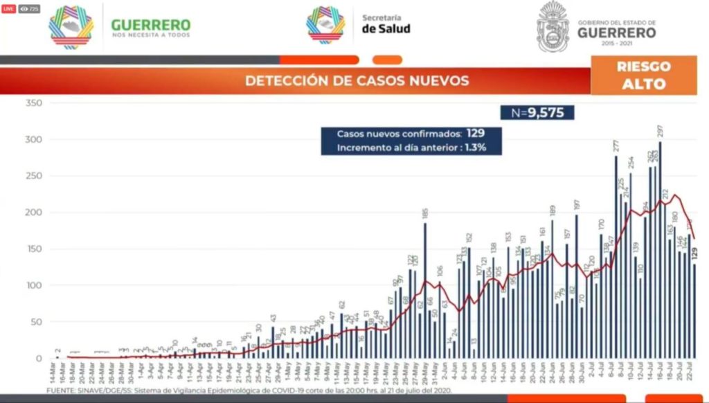 Carlos de la Peña, informó que en este momento el 86 por ciento de los nuevos contagios se concentran en 10 municipios, Acapulco, Chilpancingo, Zihuatanejo, Tixtla, Ometepec, Chilapa, Tecoanapa, Tlapa, Iguala y Atoyac.