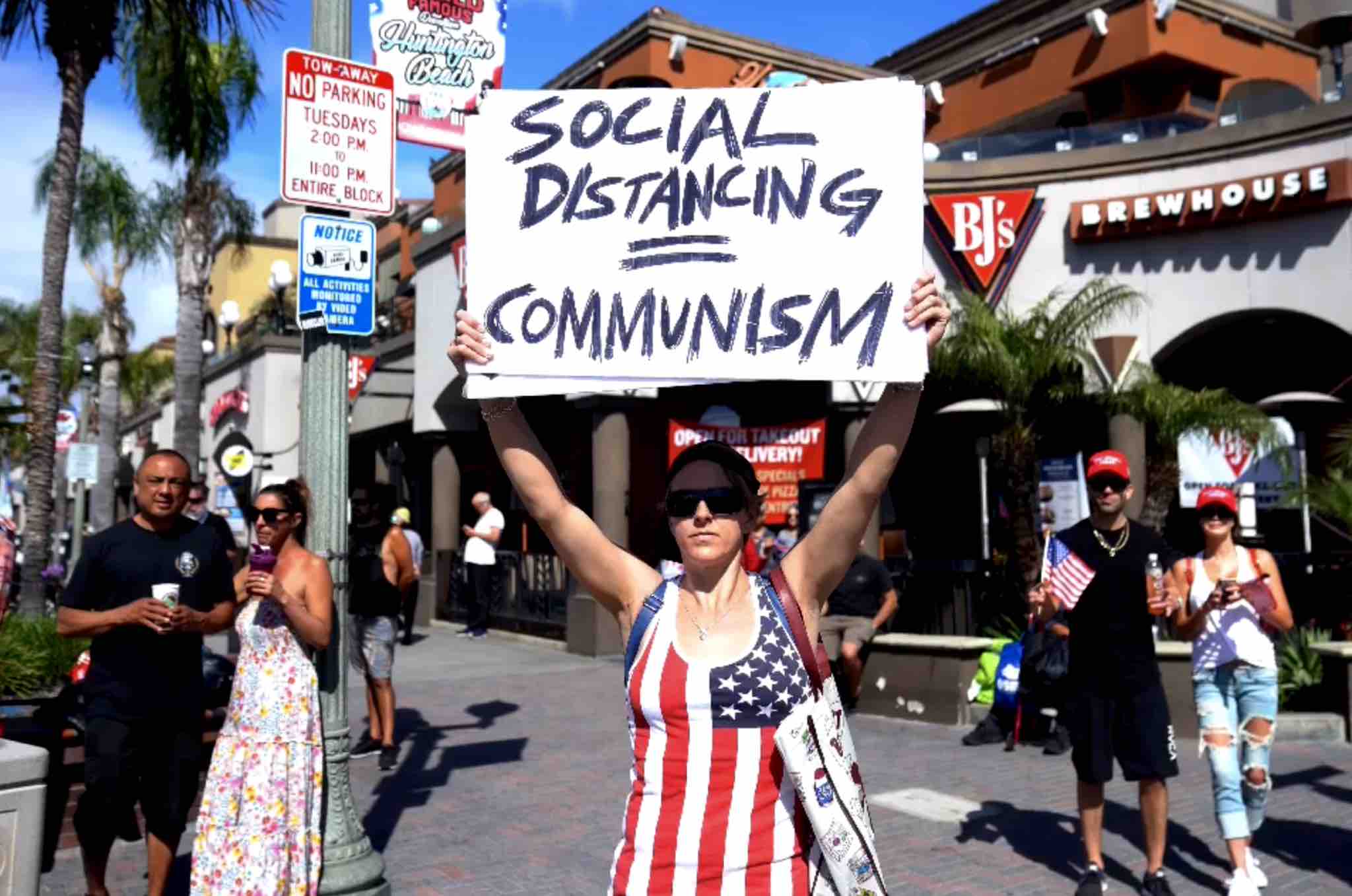 Imágenes de gente – principalmente anglosajona – se podría observar; la manera lidiar con la infección se ha politizado bastante en los Estados Unidos; una gran concentración de individuos alegaba como el comunismo y el distanciamiento físico son conceptos equivalentes.