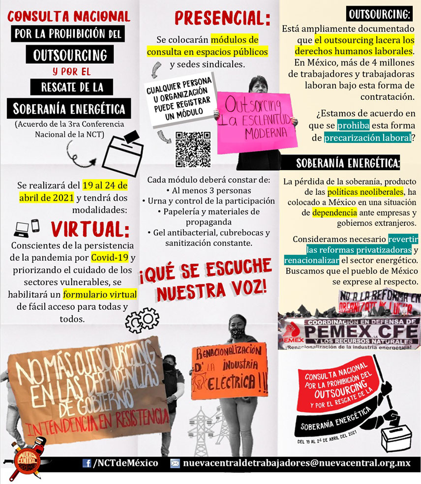 Con la instalación de más de 200 mesas receptoras en 9 estados del país y una mesa virtual, la Nueva Central de Trabajadores (NCT) y organizaciones participantes del Parlamento Abierto de Trabajadores llevan a cabo una Consulta Nacional sobre el Outsourcing y la Soberanía Energética.