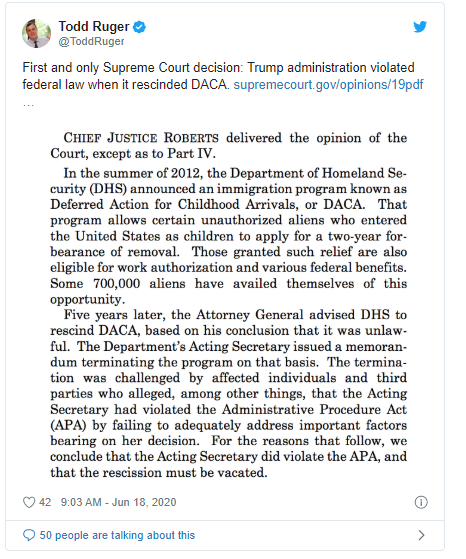 NPR destaca que Roberts y los cuatros jueces liberales de la Corte dijeron que la decisión del Departamento de Seguridad Nacional de rescindir DACA fue arbitraria y caprichosa bajo la Ley de Procedimiento Administrativo.