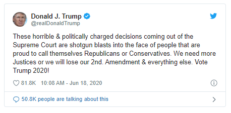 Tras darse a conocer la noticia, el presidente Trump no tardó en atacar la decisión y en un mensaje a través de Twitter aseguró que este tipo de decisiones desde la Corte Suprema son “disparos de escopeta en la cara de personas que se enorgullecen de llamarse republicanos o conservadores“.